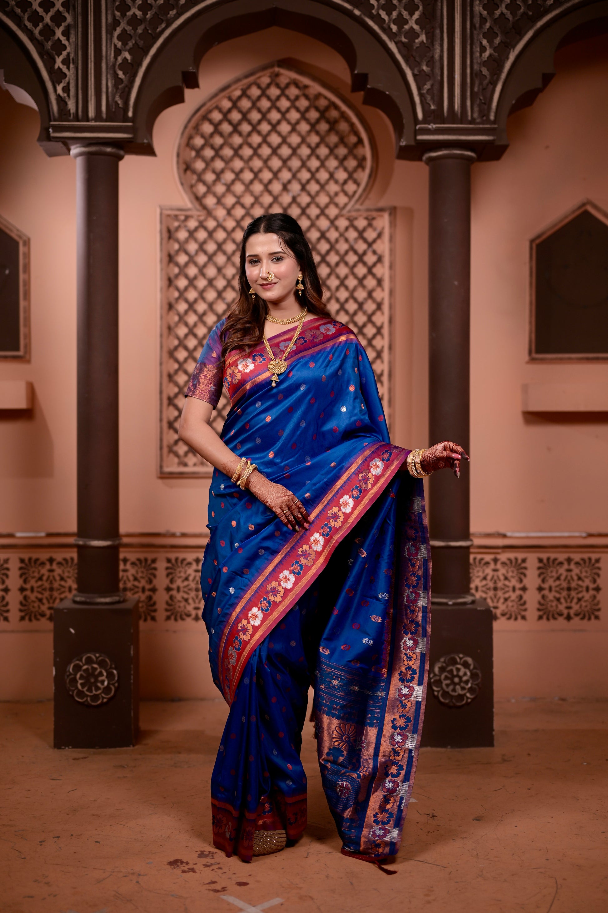 Drape yourself in elegance with this exquisite Banarasi Silk Saree, a graceful blend of tradition and refined artistry. Crafted from premium silk, this saree features a luxurious body adorned with vibrant multicolor motifs and finished with a beautifully woven traditional zari border that adds a regal charm. The rich brocade pallu further enhances its grandeur, making it a statement piece for every special occasion.
