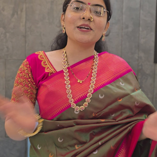 Experience elegance with this Pure Silk Chandrakor Paithani Saree, crafted from luxurious pure silk. Featuring intricate all-over Chandrakor butta, this saree is a true symbol of sophistication.