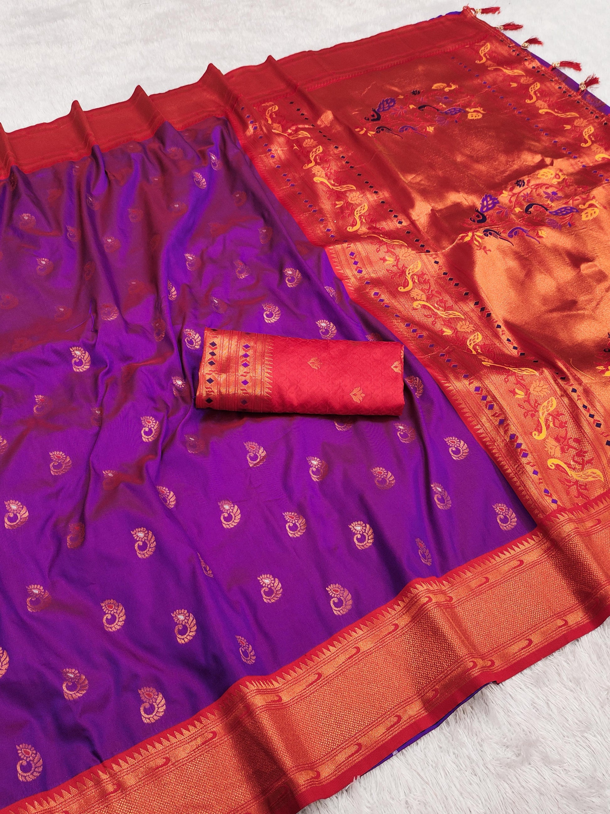 This Soft Silk Yeola Paithani saree, Delicately woven with fine Gold Zari, this saree showcases intricate patterns that epitomize the rich heritage of Paithani weaving.Whether draped for a special occasion.This Soft Silk Yeola Paithani saree is a symbol of grace and refinement.The saree include luxurious brocade blouse, perfectly complementing its traditional elegance with a touch of contemporary sophistication.