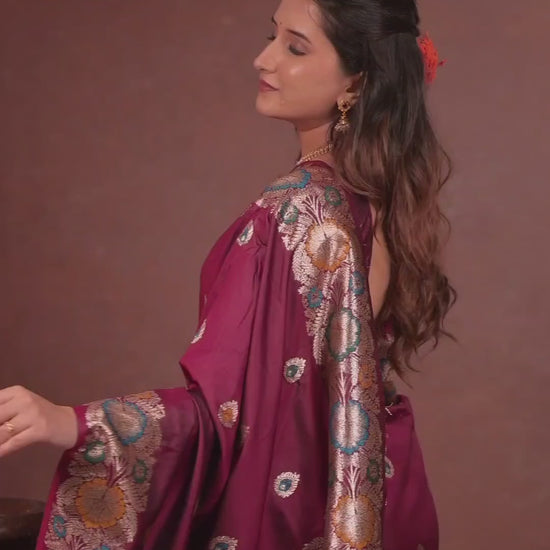 Experience the allure of tradition with this exquisite Banarasi Silk Saree, crafted with meticulous attention to detail. The saree features delicate butti work throughout the body, beautifully complemented by a luxurious zari border adorned with intricate floral motifs.