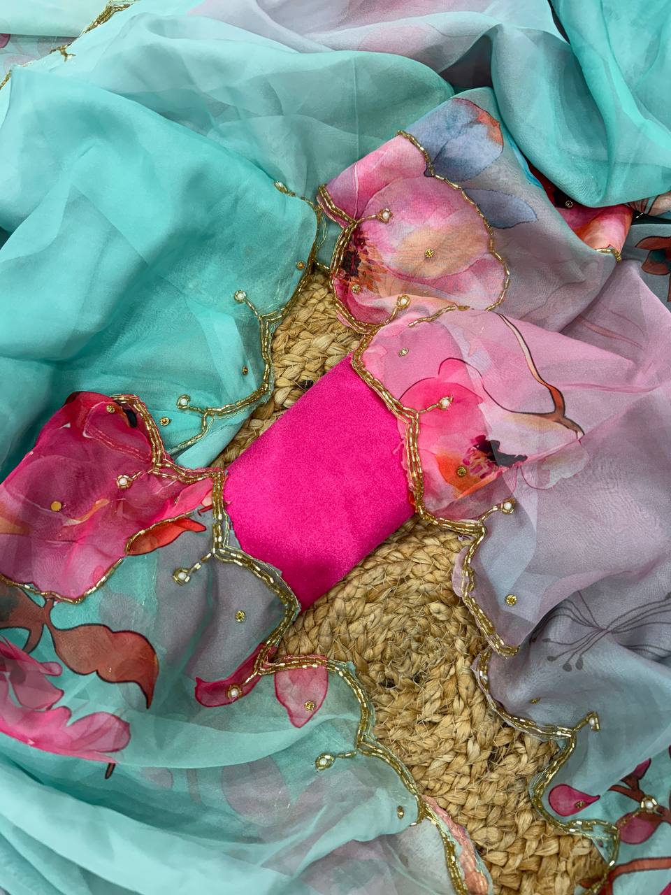 Exclusive Sky Tabby Organza Silk Saree With Handwork