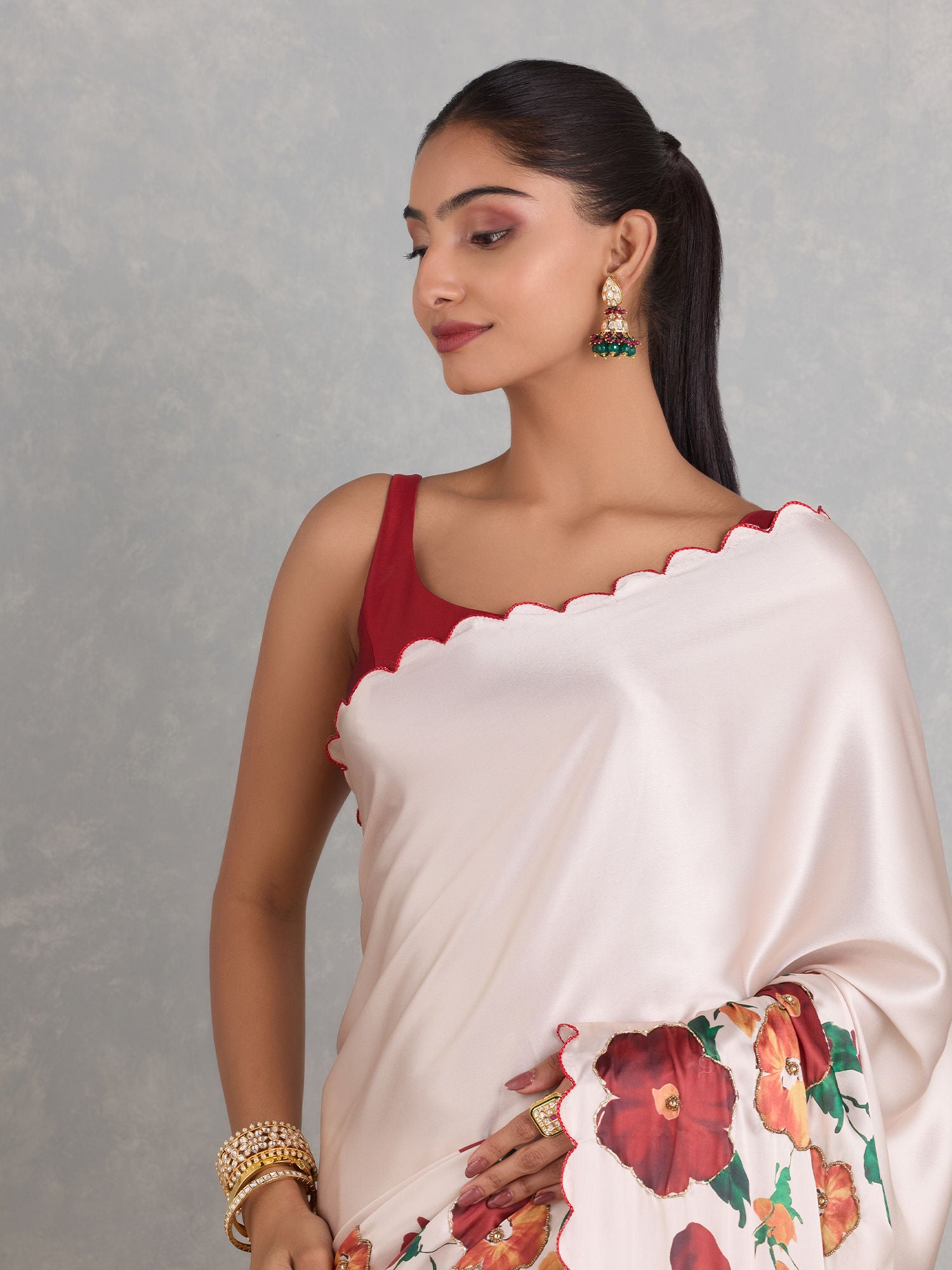 Exclusive White Japan Satin Digital Print with Handwork Saree