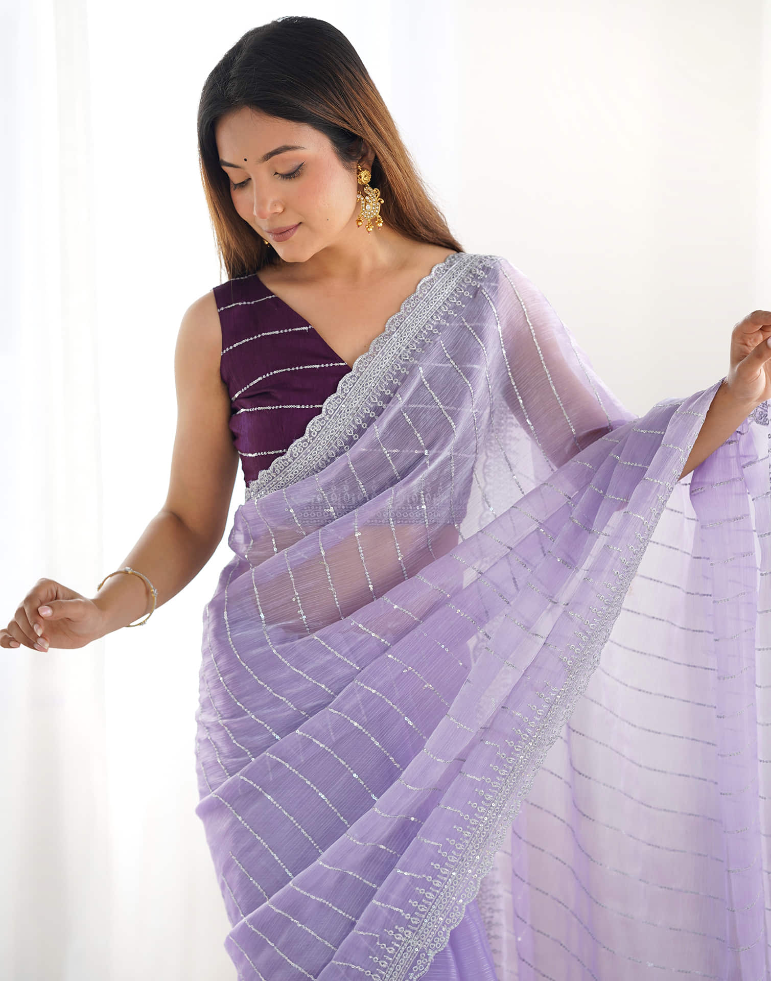 Step into elegance with this Lovender Jimmy Choo Fabric Saree featuring delicate Silver Metallic Stripes that add a subtle shimmer and grace. The saree is adorned with a beautifully detailed Cutwork border, enhancing its feminine charm. Blouse Satin banglory Silk With Dual Sequence Embroidery Work