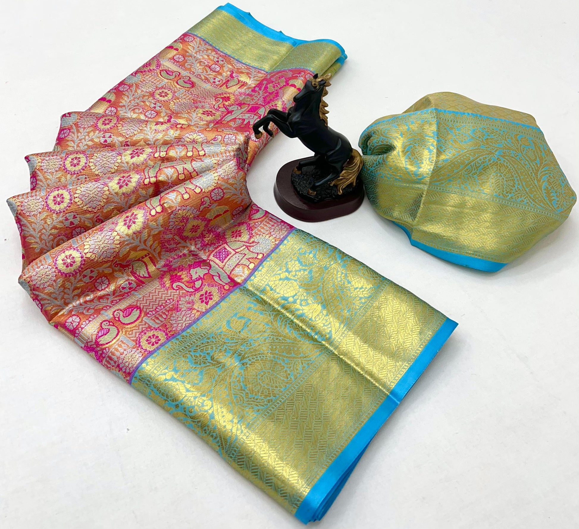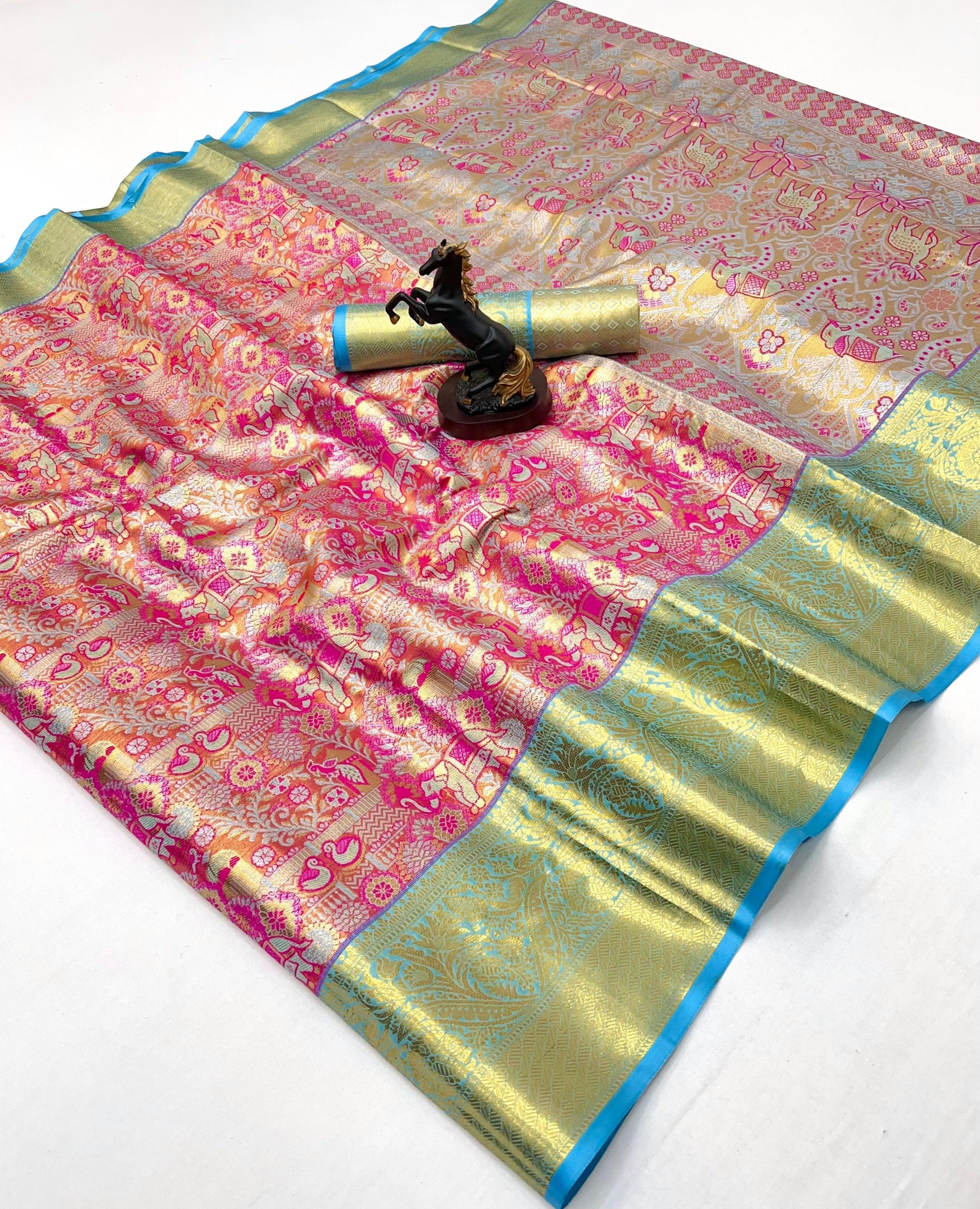 Drape yourself in timeless elegance with this luxurious Kanchipuram silk saree, crafted in a striking combination of Magenta Pink and Gold. The saree is adorned with intricate golden zari weaving featuring traditional motifs of elephants, peacocks, and floral patterns, symbolizing grandeur and heritage.