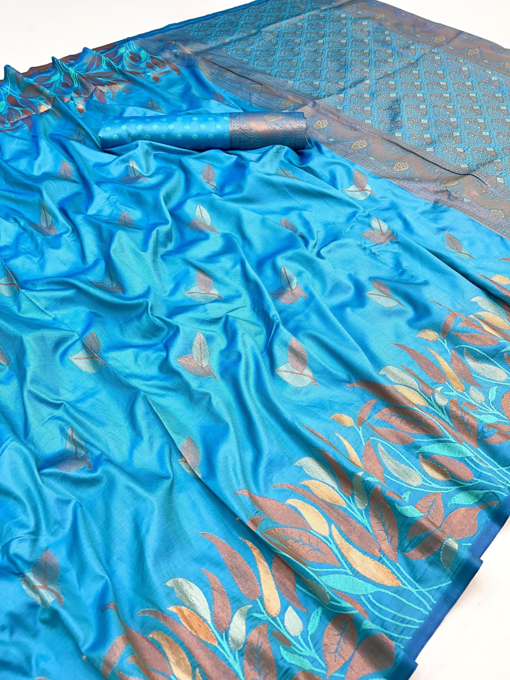 Drape yourself in timeless grace with this stunning silk saree, adorned with rich multicolor leaf motifs