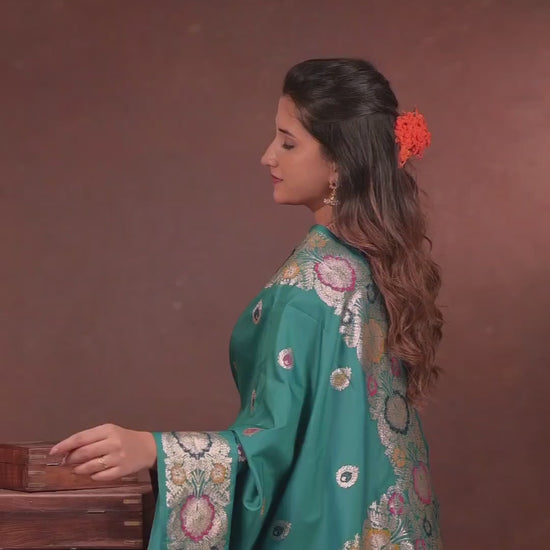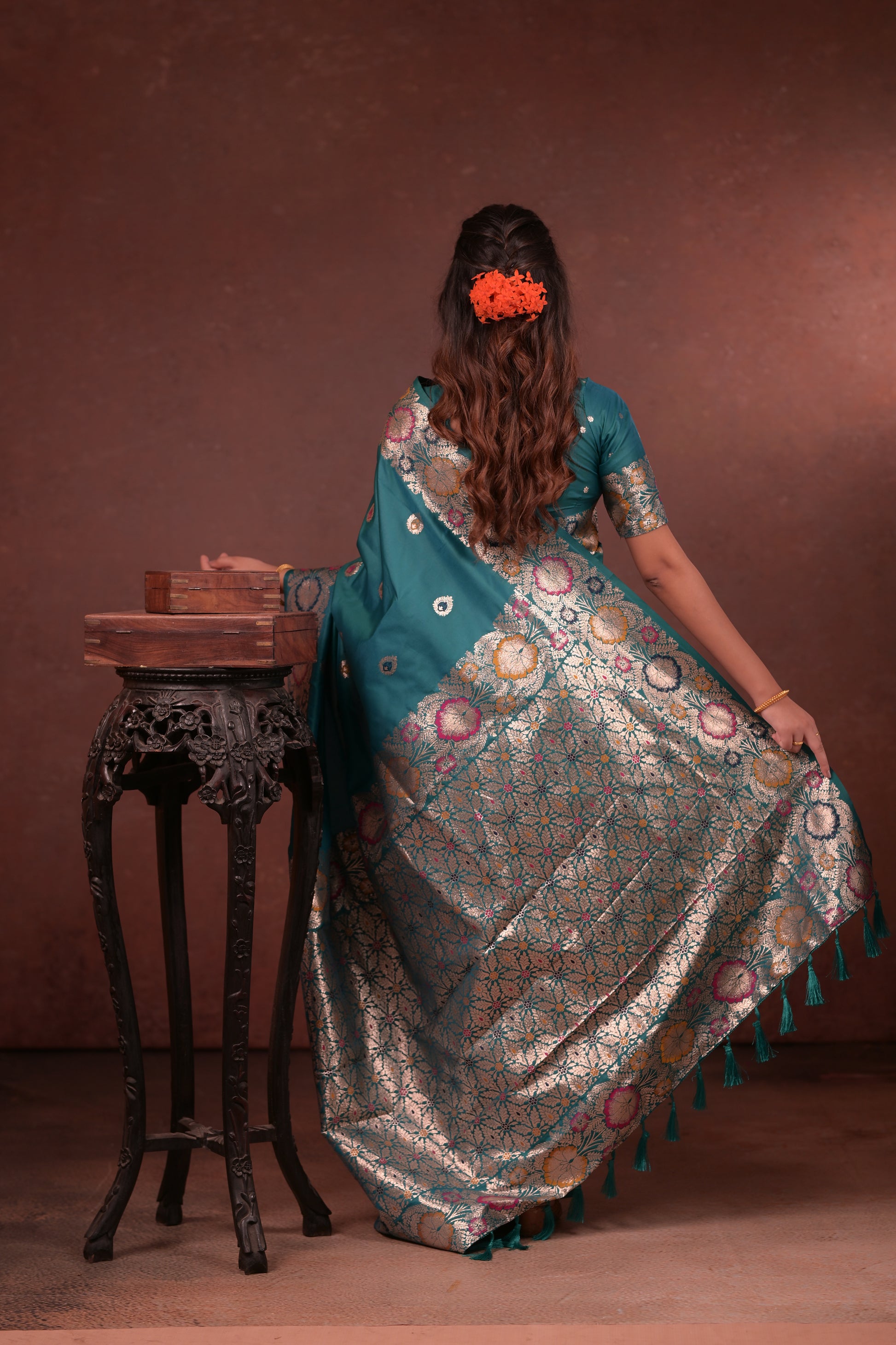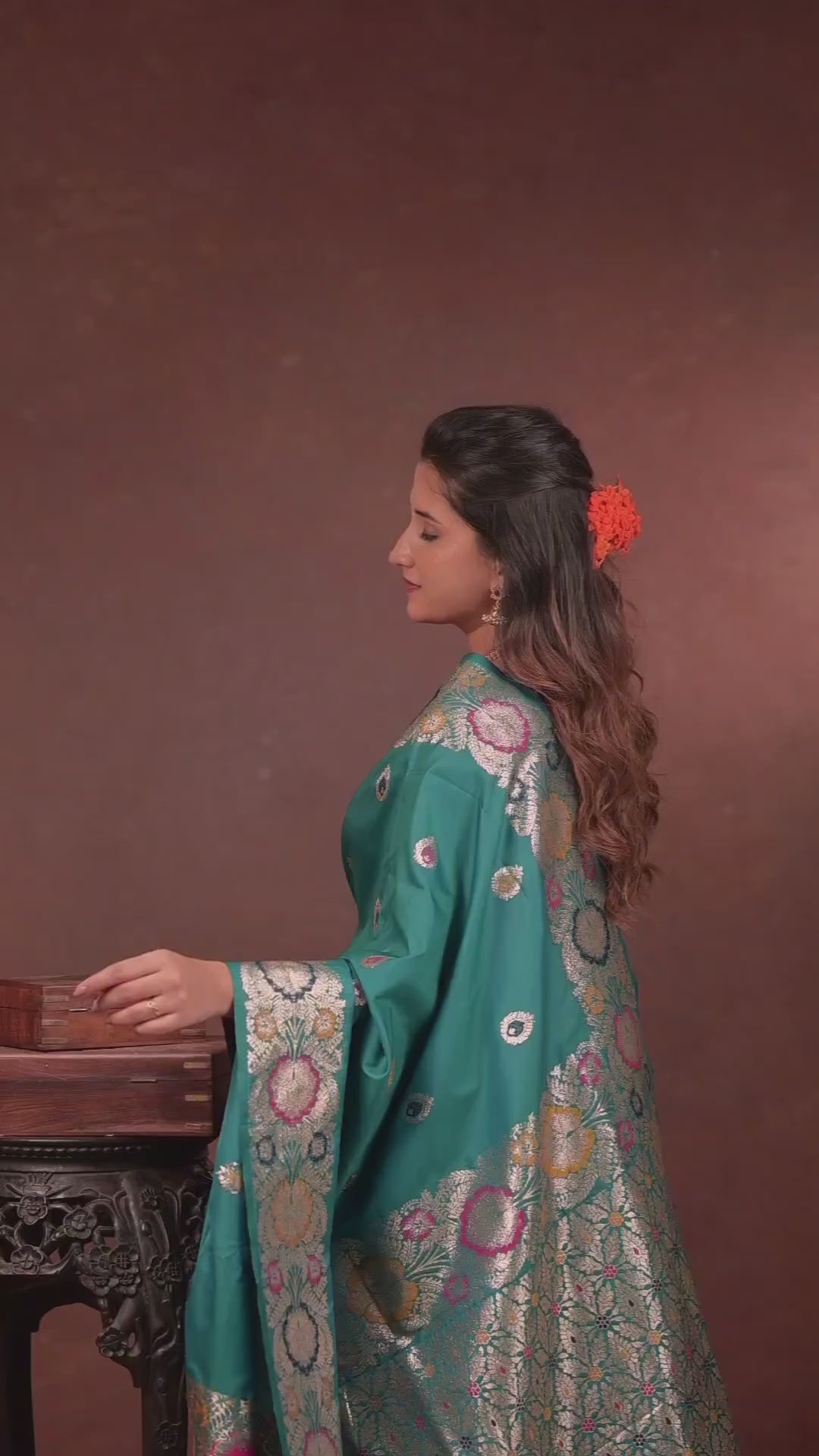 Experience the allure of tradition with this exquisite Banarasi Silk Saree, crafted with meticulous attention to detail. The saree features delicate butti work throughout the body, beautifully complemented by a luxurious zari border adorned with intricate floral motifs.