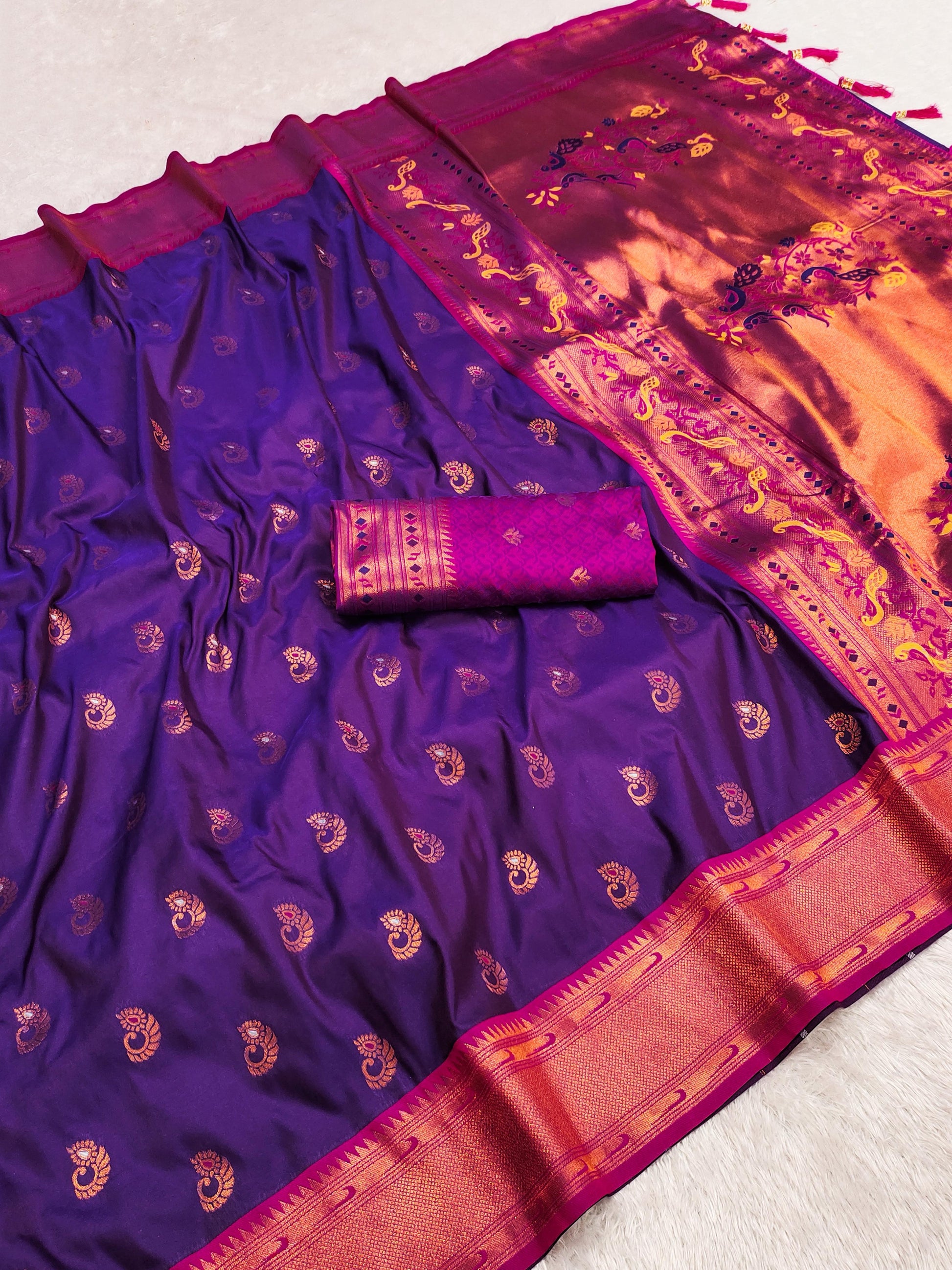 This Soft Silk Yeola Paithani saree, Delicately woven with fine Gold Zari, this saree showcases intricate patterns that epitomize the rich heritage of Paithani weaving.Whether draped for a special occasion.This Soft Silk Yeola Paithani saree is a symbol of grace and refinement.The saree include luxurious brocade blouse, perfectly complementing its traditional elegance with a touch of contemporary sophistication.