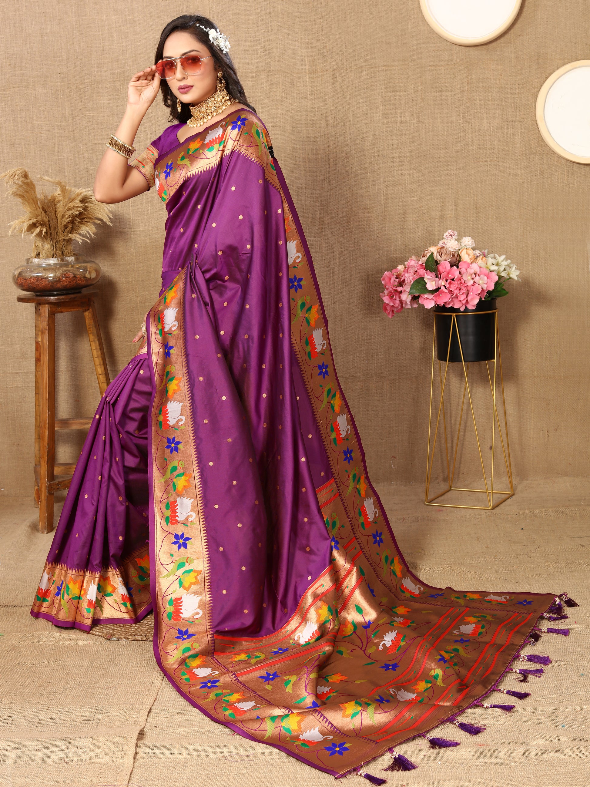 Drape yourself in elegance with this pure fabric saree featuring a striking Wine base adorned with golden woven buttas scattered across the body. The highlight of this masterpiece is its intricately designed pallu, showcasing vibrant motifs of a swan, birds, and blooming lotuses expertly woven in multicolour threads over a contrasting orange backdrop. This exquisite artwork lends a rich, traditional touch to the saree, making it perfect for festive occasions, poojas, and cultural events.